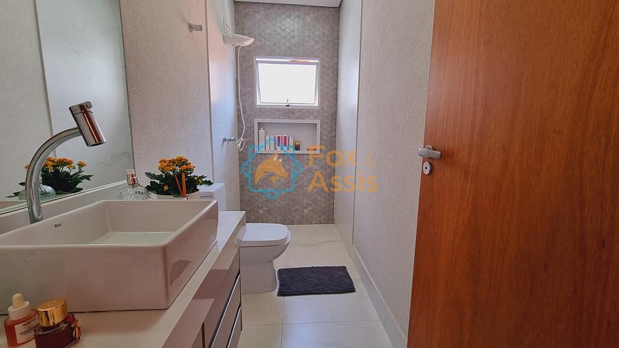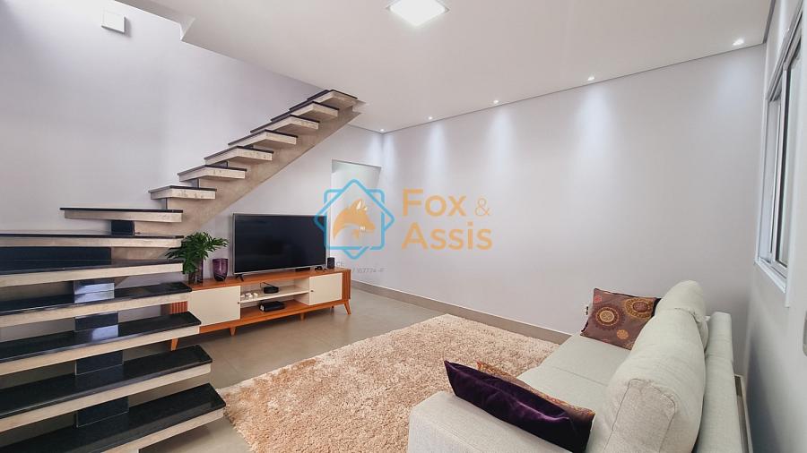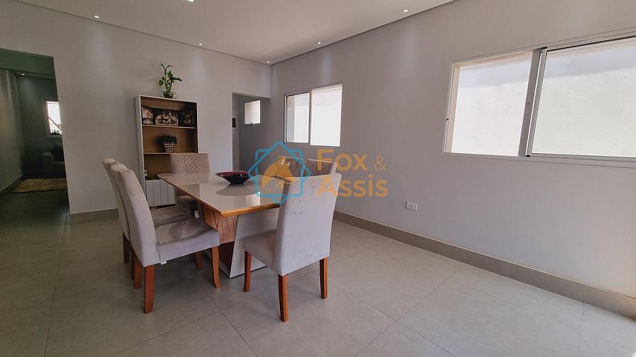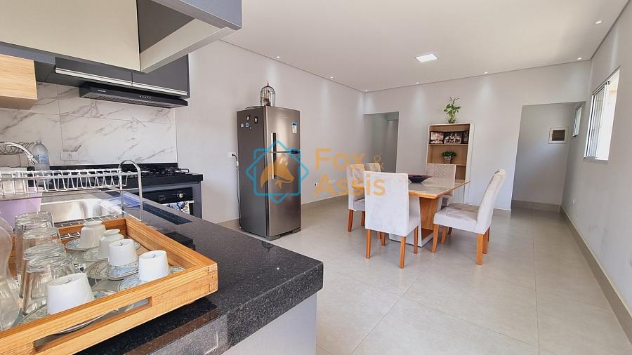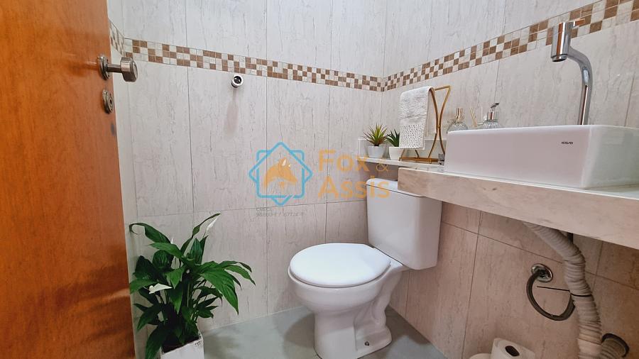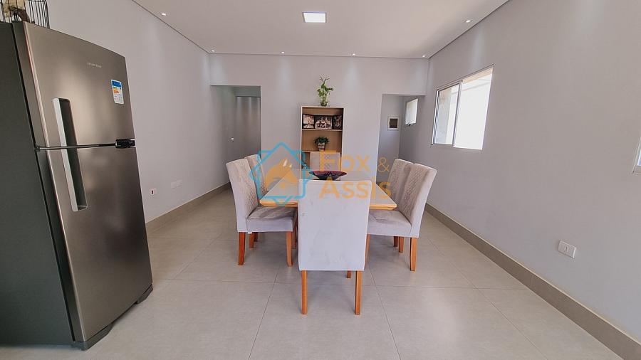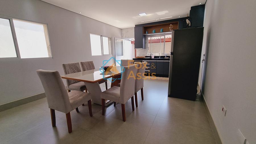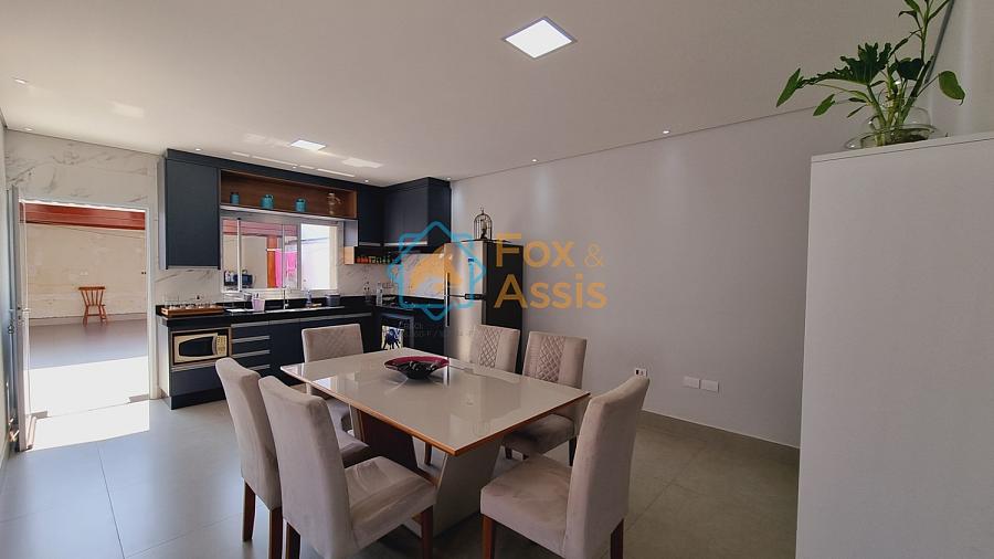 Sobrado de fino acabamento, sendo piso térreo, sala de tv, rebaixo de gesso, 01 lavabo, cozinha planejada, integrada à sala de jantar, fundos área de churrasqueira, 01 lavanderia, 03 vagas.
