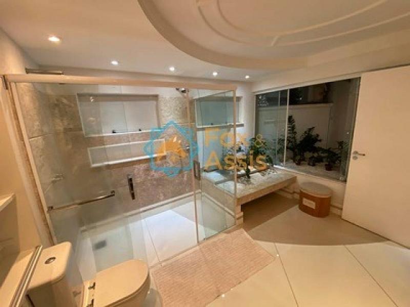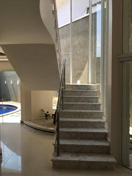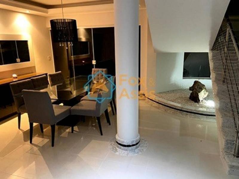 Hall de entrada com pé direito duplo, circulação vertical composta de escada em mármore carrara, 01 escritório, aquecimento solar com boiler, armários planejados, ar-condicionado, ampla sala de estar, sala de jantar, home theater, cozinha com balcão em mármore, água quente/fria e jardim de inverno.