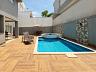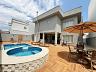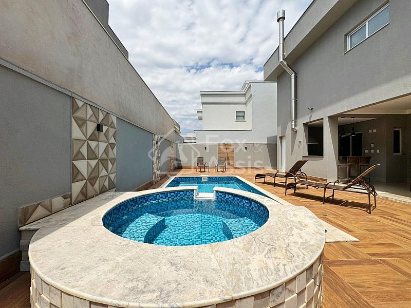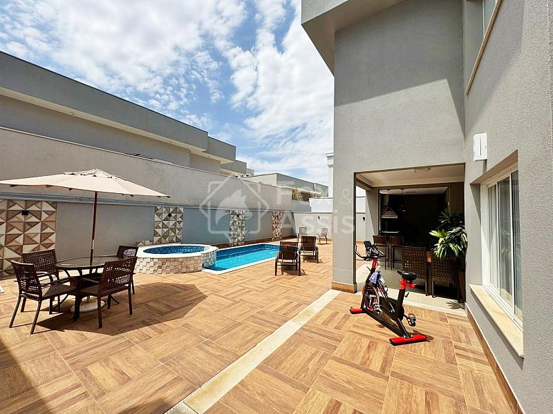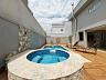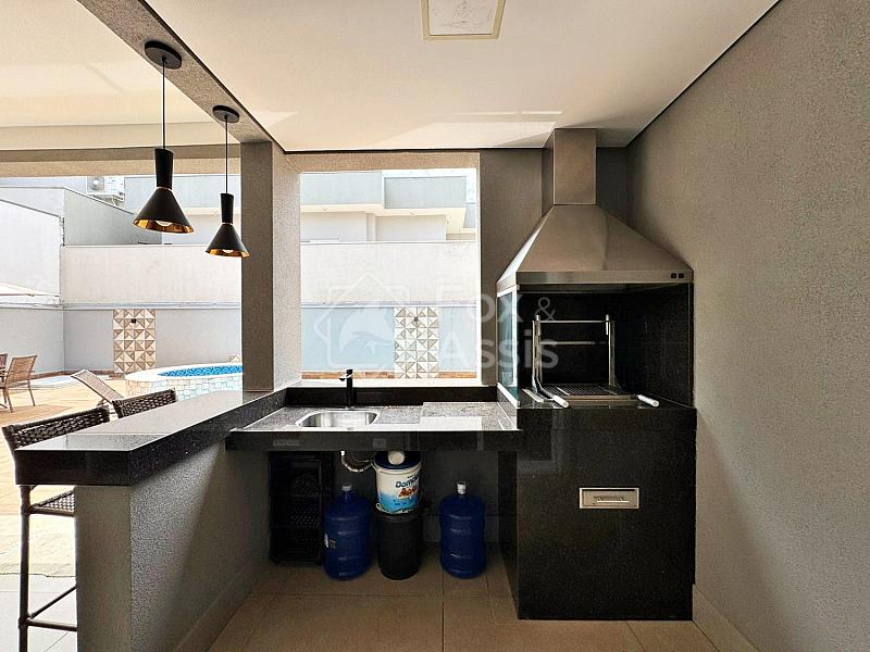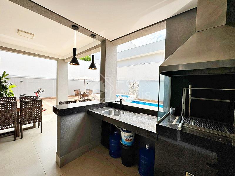 Área externa ampla com espaço gourmet, churrasqueira e pia de apoio, com vista para uma linda piscina com hidromassagem.