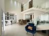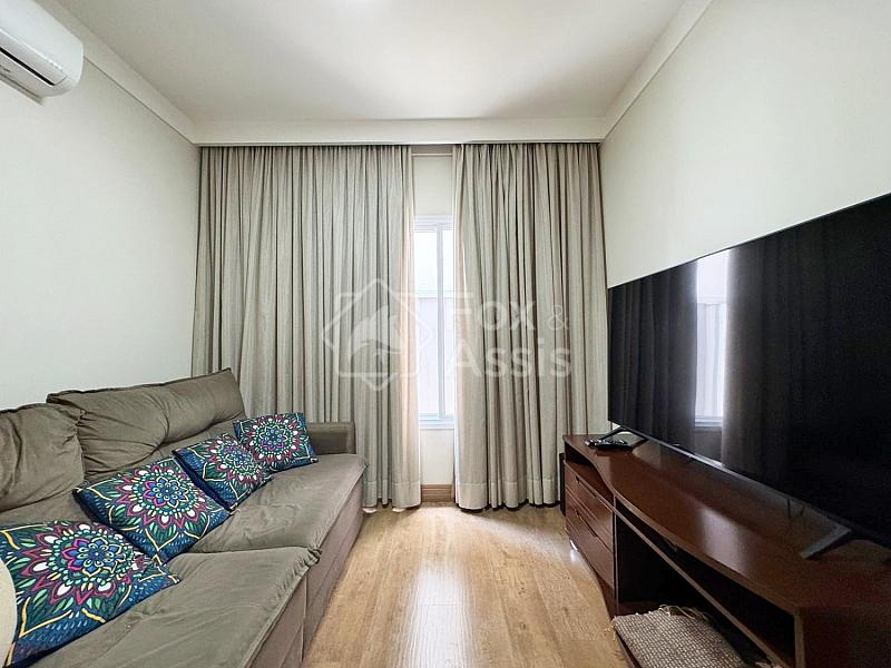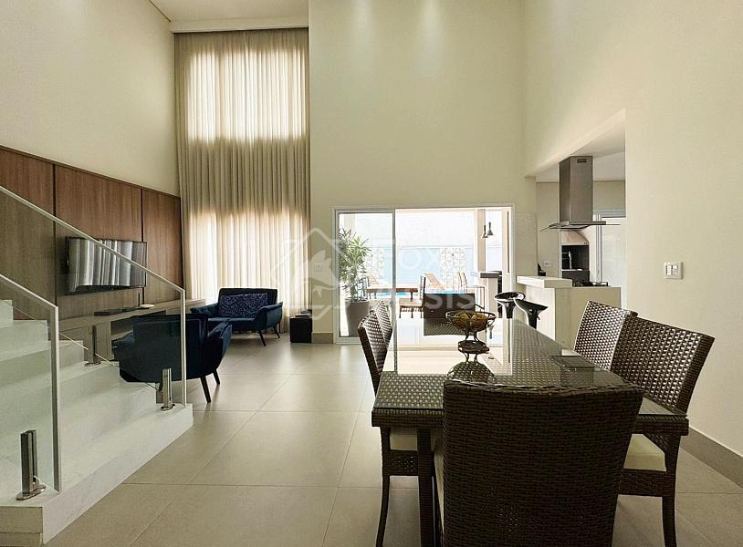 Amplo living com pé direito alto e sala 02 ambientes integrada a cozinha em padrão americana com balcão e sala de TV privativa climatizada.