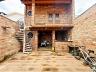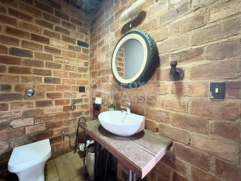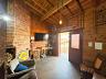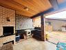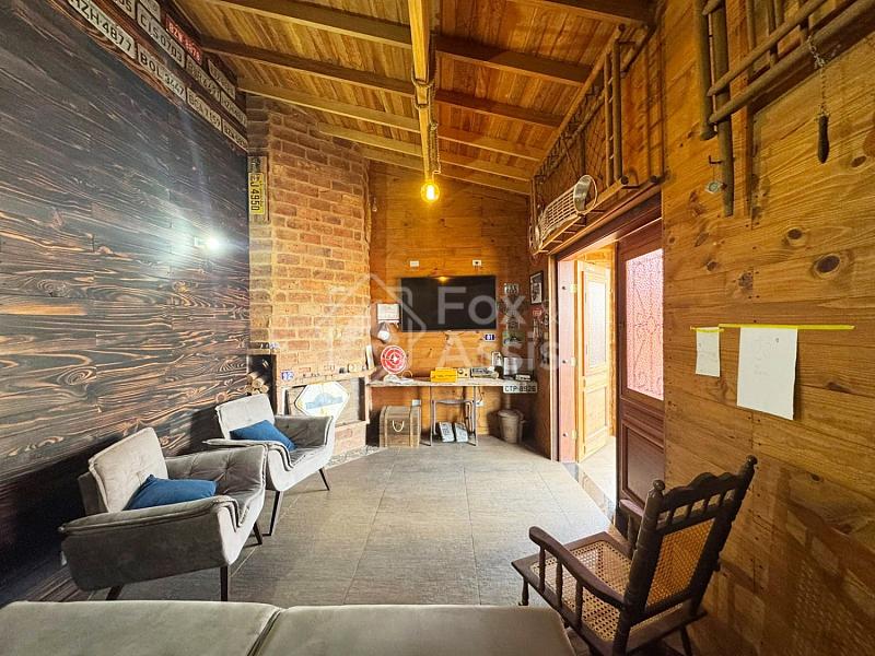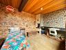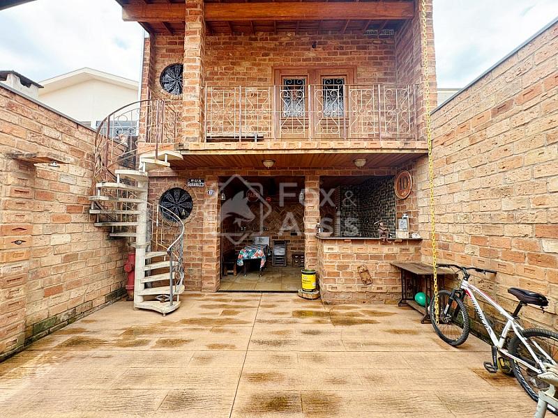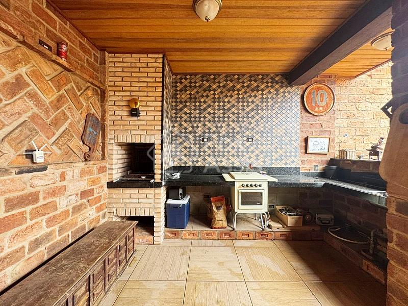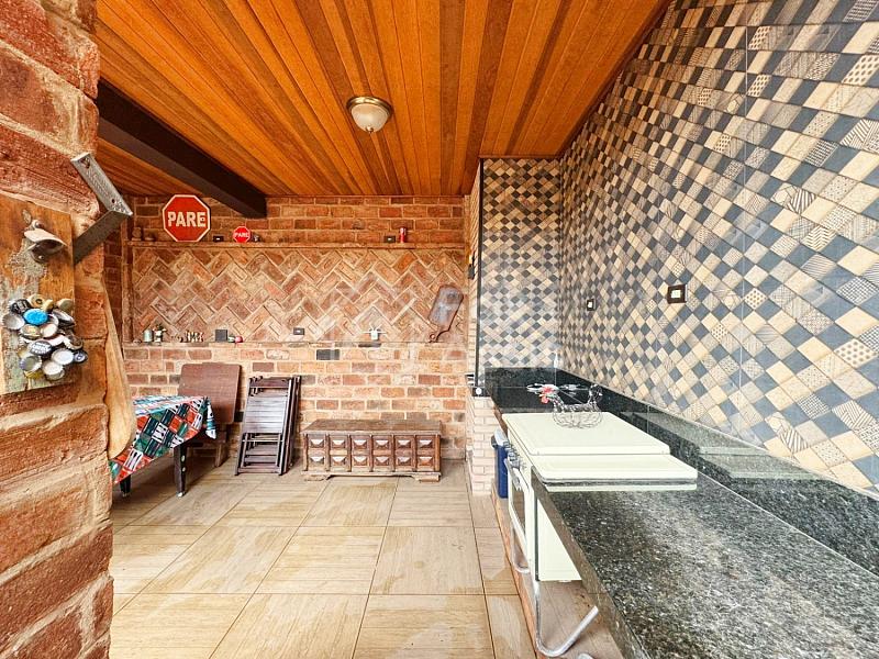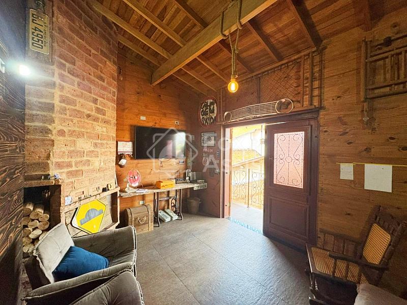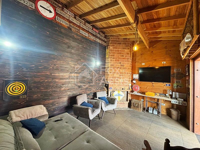 Área gourmet em estilo rústico com acabamento em madeira, churrasqueira e pia de apoio, pavimento superior com 1 sala e 1 banheiro social.